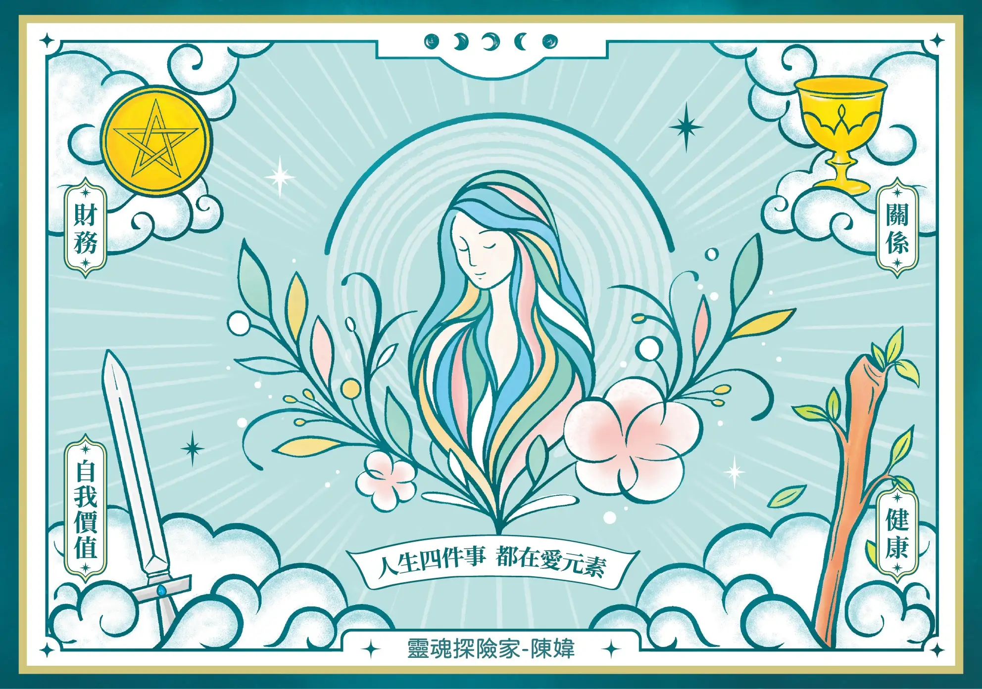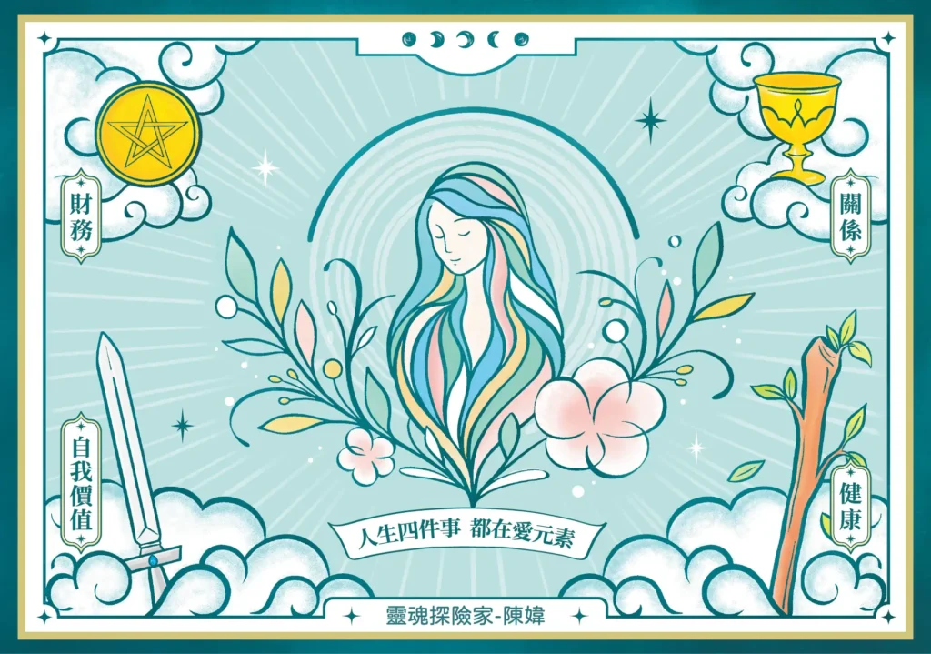塔羅四元素分別對應人生四件事,若這四件事完整、穩定,生命能量就會維持在動態平衡裡,產生最大動能。人生四件事,每一件事都是「愛」的延伸,「愛」作為第五元素隱身於每個角落,而你便是愛的軸心。愛是人類本能,天使靈氣幫助我恢復本能,做一個有能力愛自己,也愛別人的人。宇宙無邊無際,試煉也從不止息,我們都要好好照顧這四件事,我為此總結:「人生四件事,都在愛元素」,以此為品牌靈魂。